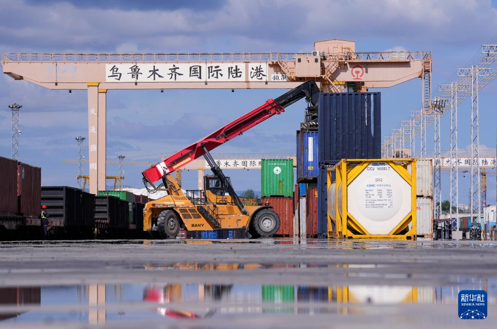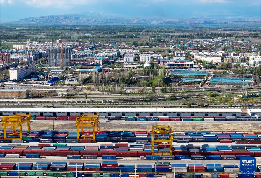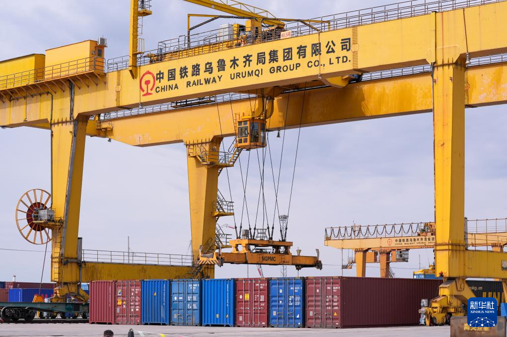 在新疆烏魯木齊國際陸港區,集裝箱裝卸作業有序進行(2024年5月27日攝)。新華社記者 王菲 攝