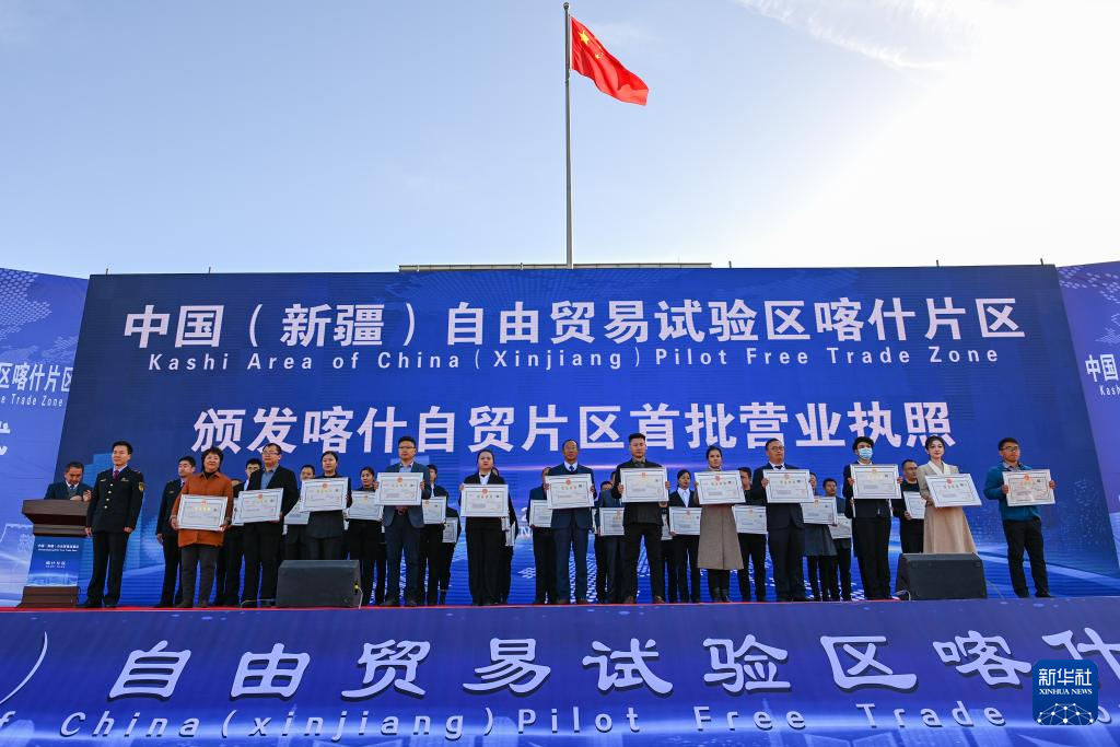2023年11月11日,在中國(新疆)自由貿易試驗區喀什片區揭牌儀式現場,首批入駐自貿片區的經營主體獲頒營業執照。新華社記者 丁磊 攝