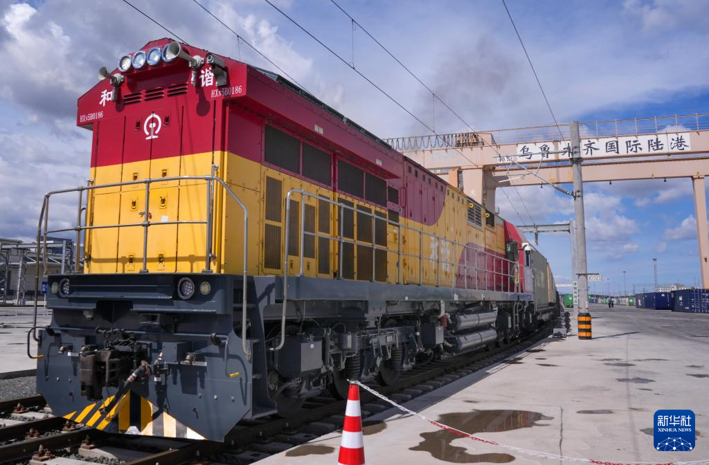 2024年5月27日,一列滿載貨物的中歐班列駛離新疆烏魯木齊國際陸港區。新華社記者 王菲 攝