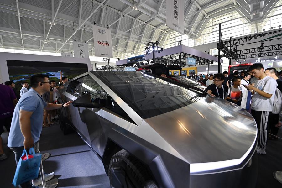 在天津舉行的2024世界智能產(chǎn)業(yè)博覽會(huì)上,觀(guān)眾在特斯拉展臺(tái)參觀(guān)(6月22日攝)。新華社記者 李然 攝