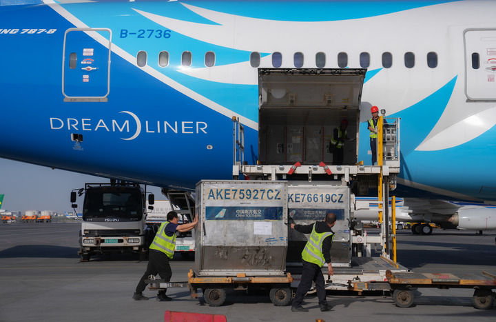 南航工作人員在烏魯木齊地窩堡國際機場裝卸國際航班貨物(2024年4月28日攝)。新華社發(車捷 攝)