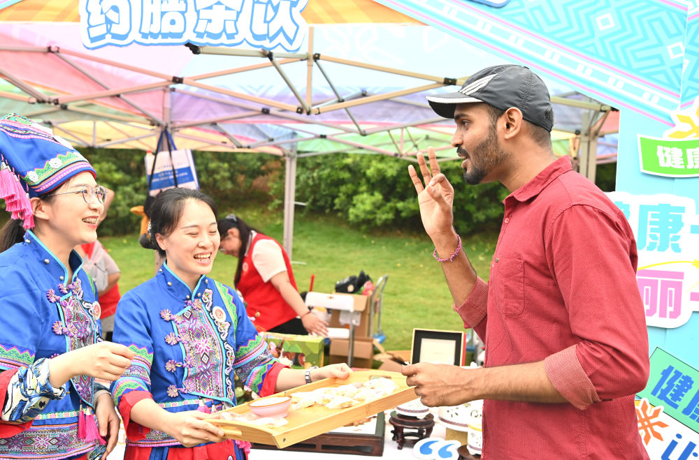 2024年4月11日,一名外國游客在“廣西三月三·八桂嘉年華”活動(dòng)廣西南寧市青秀山主會(huì)場品嘗美食后做出“OK”手勢。新華社記者周華攝