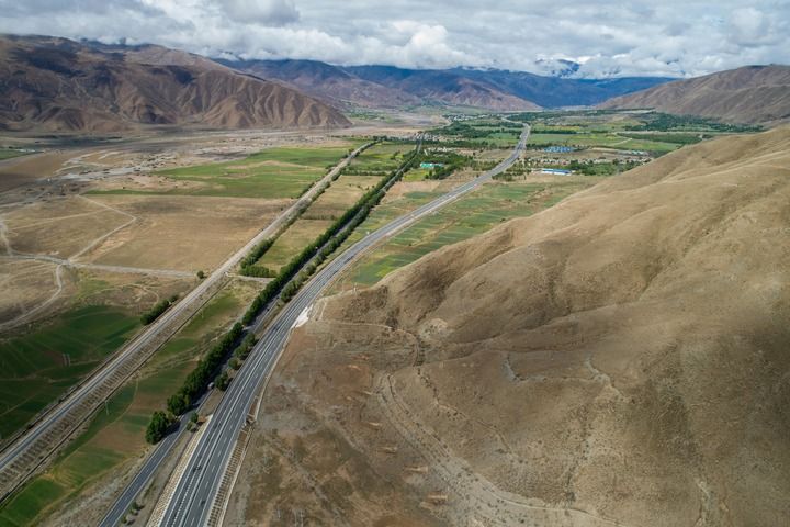 俯瞰西藏拉薩市至日喀則市區間的交通網絡,從左至右依次為農村公路、鐵路、國道和高等級公路(2024年6月27日攝,無人機照片)。
