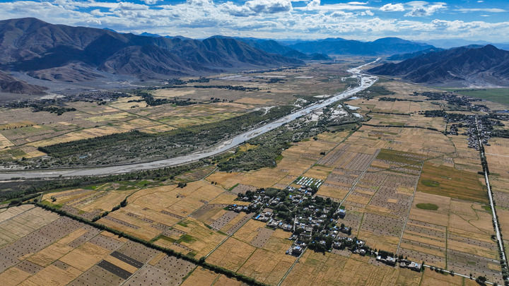 西藏日喀則市年楚河流域縱橫交錯的鄉村道路(2023年9月6日攝,無人機照片)。新華社記者 晉美多吉 攝