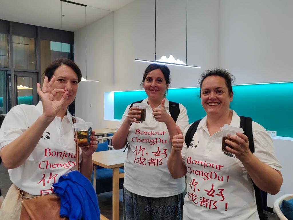 7月13日,在品嘗中藥茶飲后,三名法國中醫藥愛好者表示非常滿意。新華社記者 董小紅 攝