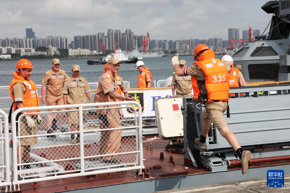 7月15日,俄“響亮”號護(hù)衛(wèi)艦艦員完成撤跳板工作后返回。新華社記者 黎云 攝