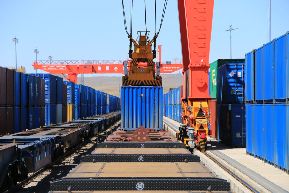 5月15日,中國鐵路哈爾濱局集團有限公司滿洲里站貨運車間集裝箱場在對中歐班列進行換裝作業。新華社發(黃旭攝)
