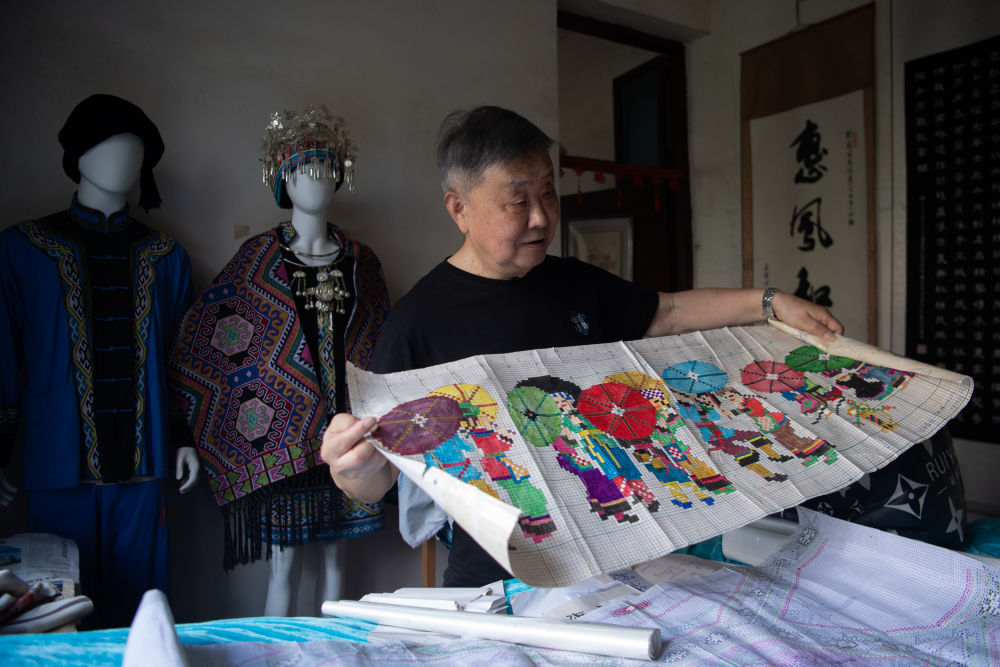 7月2日,湖北省來鳳縣桂花樹社區(qū),唐洪祥在家中展示西蘭卡普圖紙。