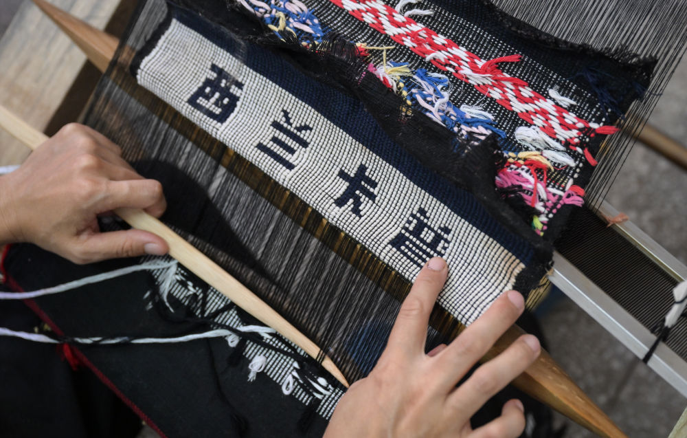 湖北省來鳳縣桂花樹社區(qū),一件“西蘭卡普”字樣的作品在織機上成形(7月2日攝)。