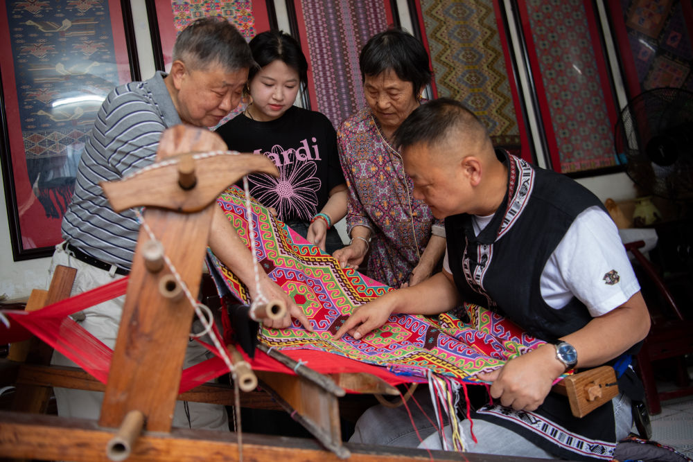 7月2日,唐洪祥的孫女唐鳴珂(后右一)在來鳳縣西蘭卡普培訓(xùn)班上展示西蘭卡普成品。今年29歲的唐鳴珂國外留學(xué)后回到家鄉(xiāng),從事西蘭卡普的傳承發(fā)展工作。