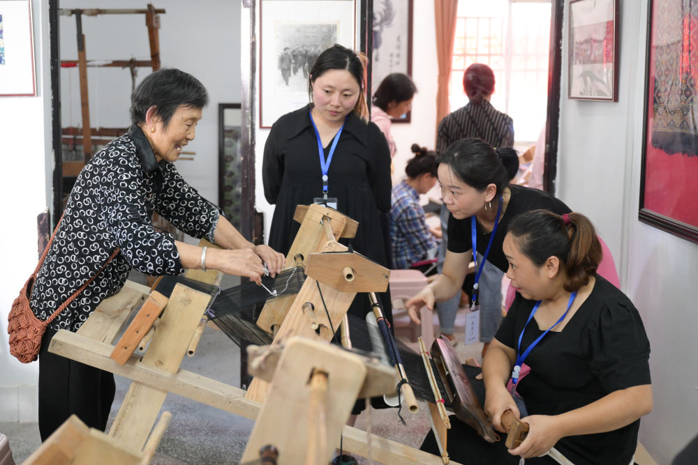 7月2日,唐洪祥的老伴劉秀琴(后左一)指導(dǎo)前來學(xué)藝的學(xué)員們操作織機。