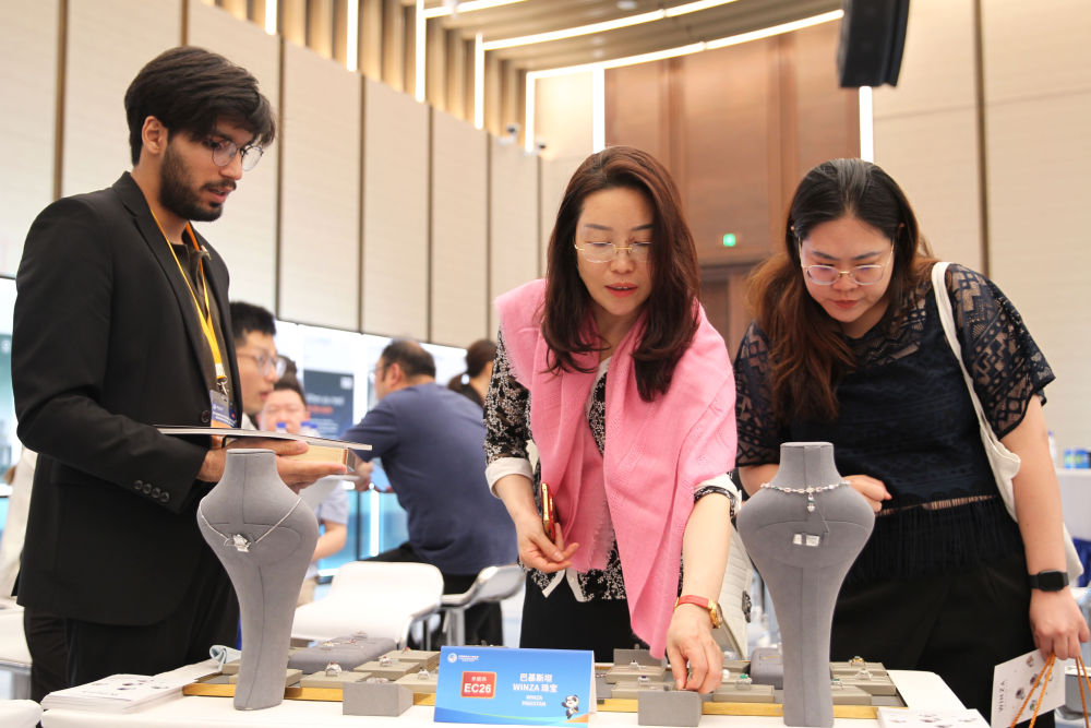 2024年7月9日,一名外國參展企業工作人員(左)向采購商介紹企業產品。(陳浩明 攝)