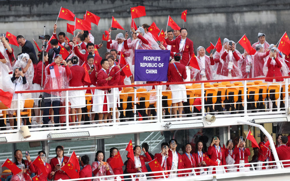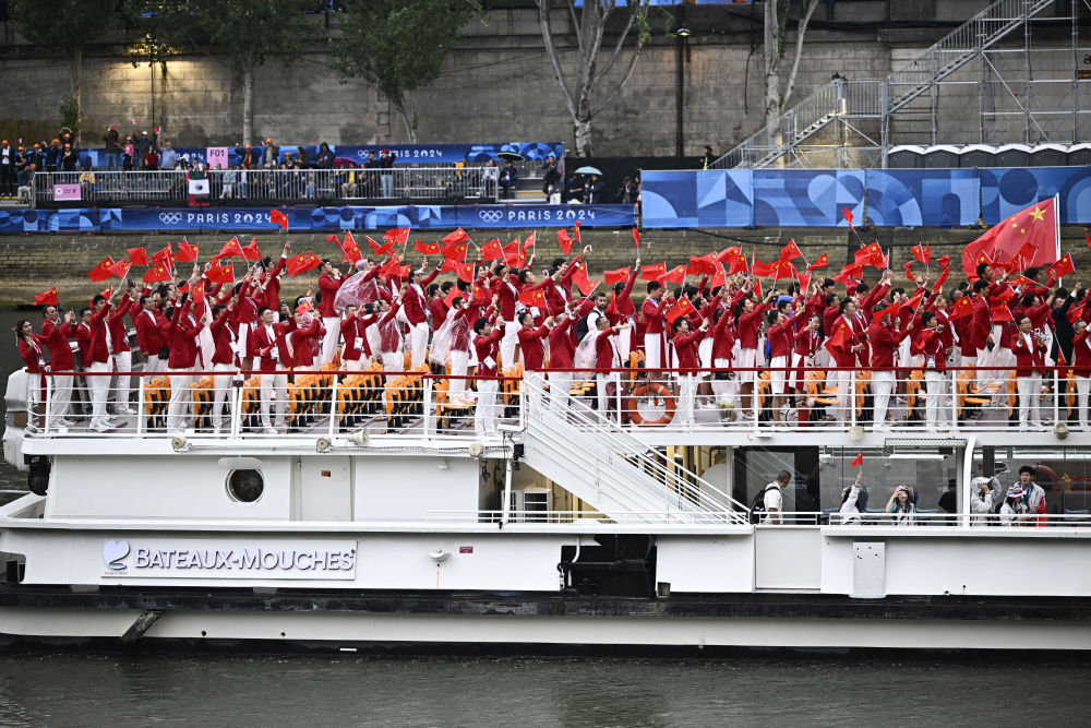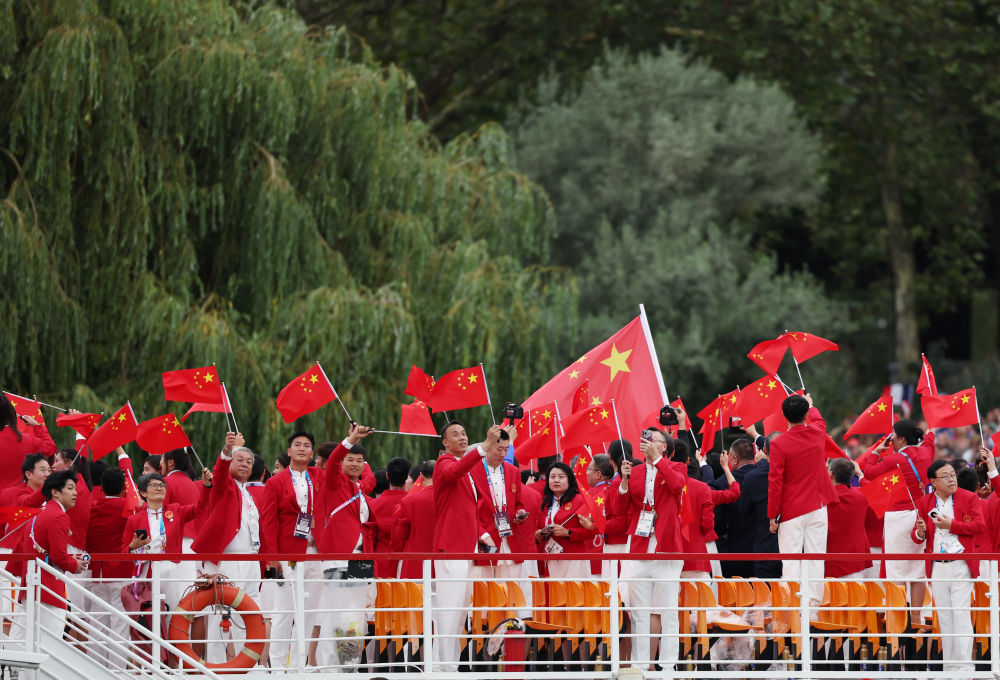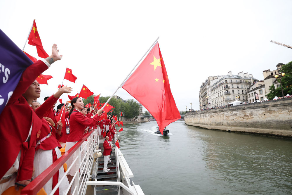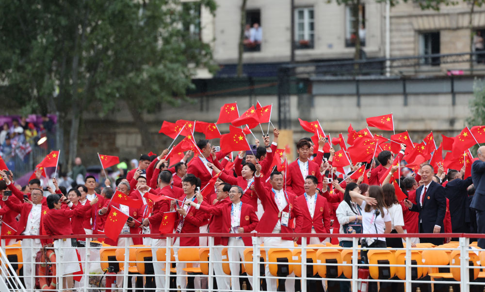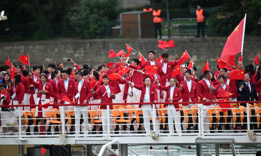 當地時間7月26日,第33屆夏季奧林匹克運動會開幕式在法國巴黎舉行。乒乓球運動員馬龍、花樣游泳運動員馮雨高擎五星紅旗,中國體育代表團運動員乘船在塞納河巡游。