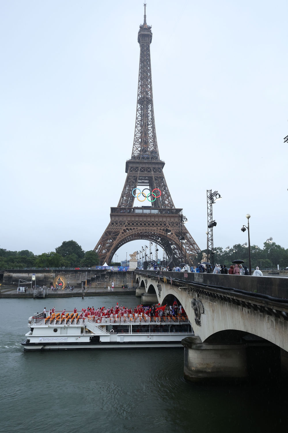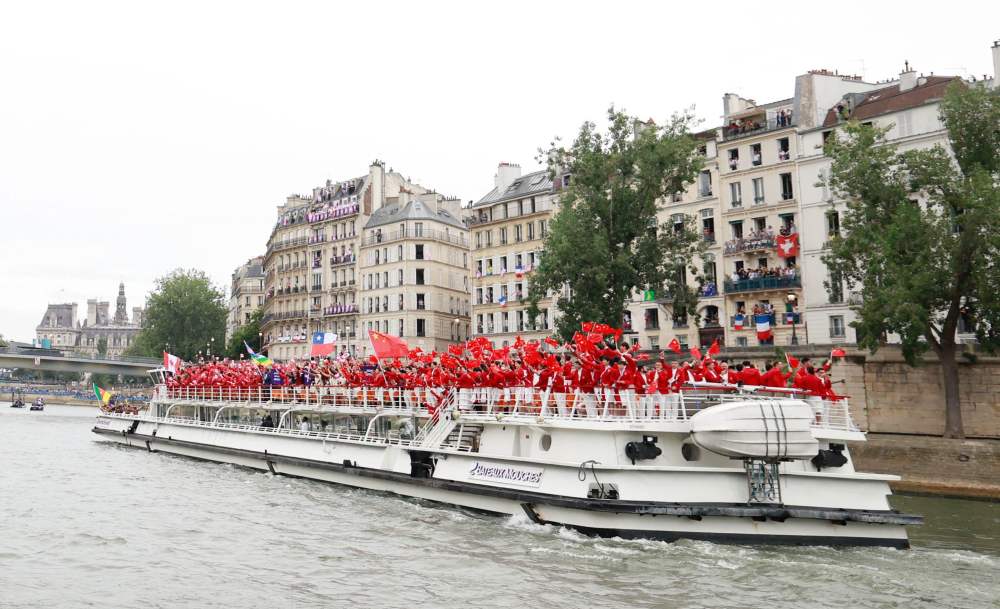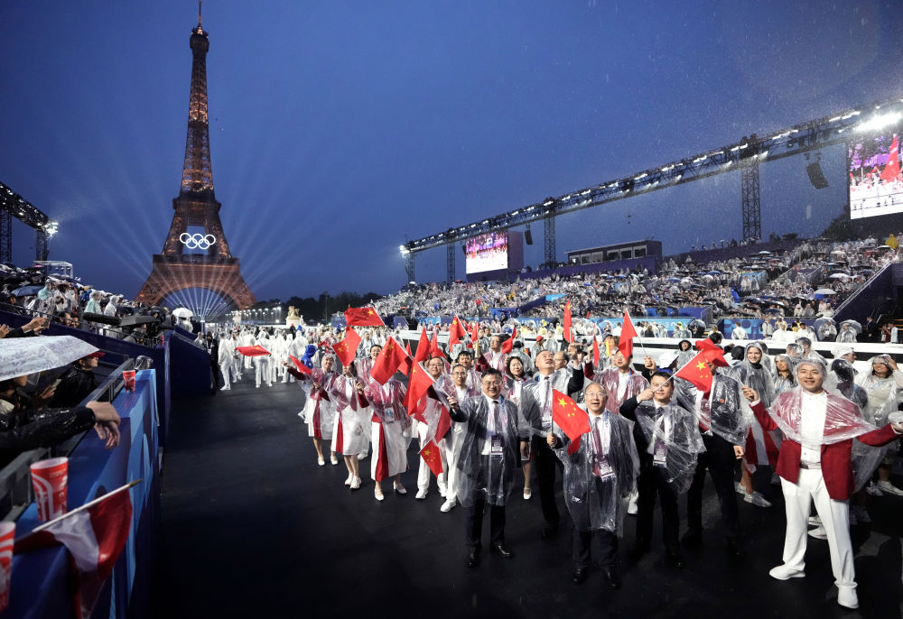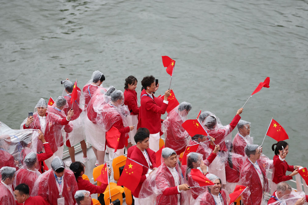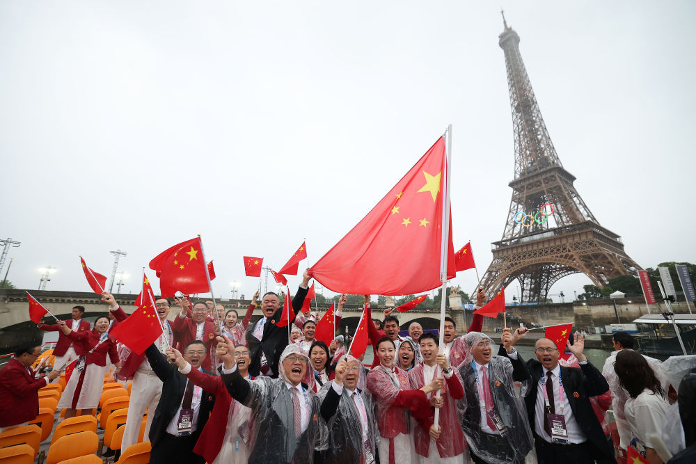 當地時間7月26日,第33屆夏季奧林匹克運動會開幕式在法國巴黎舉行。乒乓球運動員馬龍、花樣游泳運動員馮雨高擎五星紅旗,中國體育代表團運動員乘船在塞納河巡游。