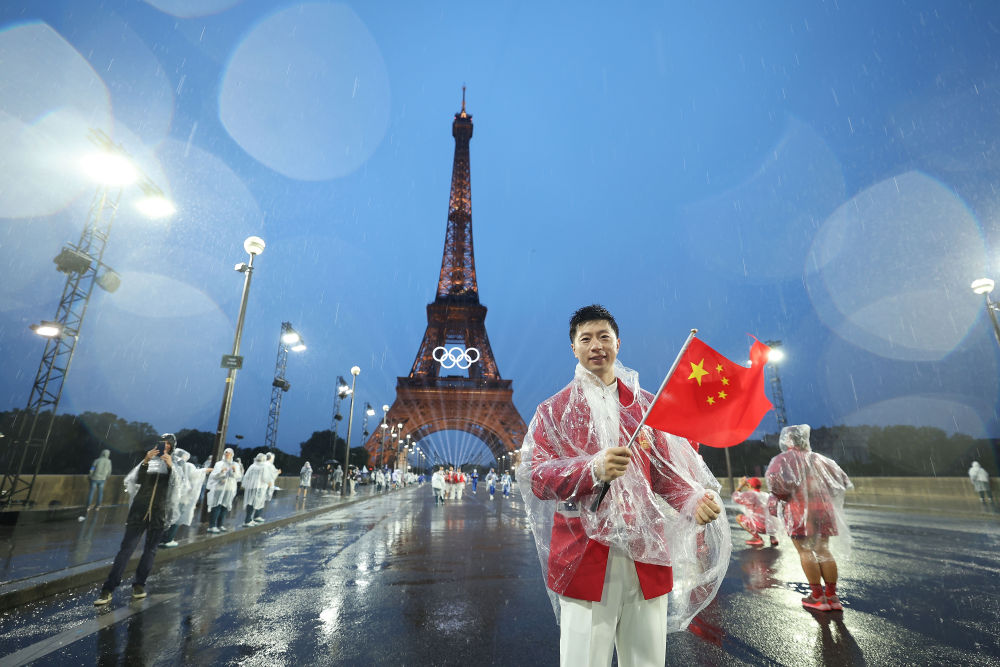 ↑中國體育代表團旗手、乒乓球選手馬龍在埃菲爾鐵塔前。新華社記者 李明攝