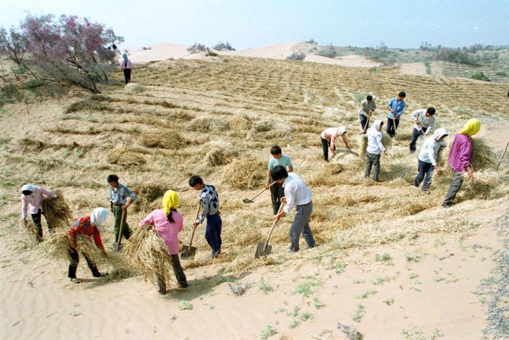 寧夏中衛固沙林場職工在扎麥草方格(1994年9月24日攝)。新華社記者 劉海峰 攝