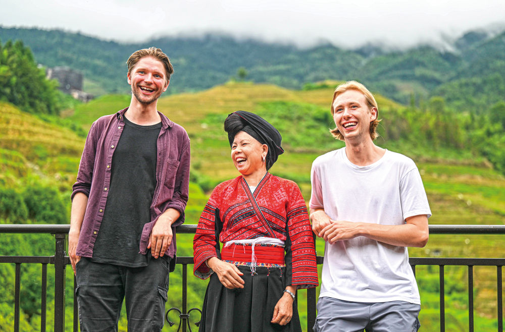 廣西桂林市龍勝各族自治縣龍脊鎮(zhèn)大寨村村民潘鳳蘭(中)在她家民宿外和兩位德國(guó)游客交流(六月二十六日攝)。新華社記者趙子碩攝