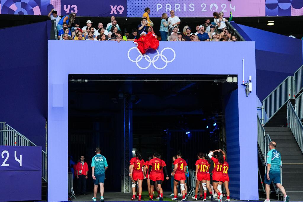 7月29日,中國隊選手劉瀟倩(右三)在賽后退場時向觀眾“比心”。當日,在巴黎奧運會七人制橄欖球女子四分之一決賽中,中國隊5比55不敵新西蘭隊。 新華社記者 許暢 攝