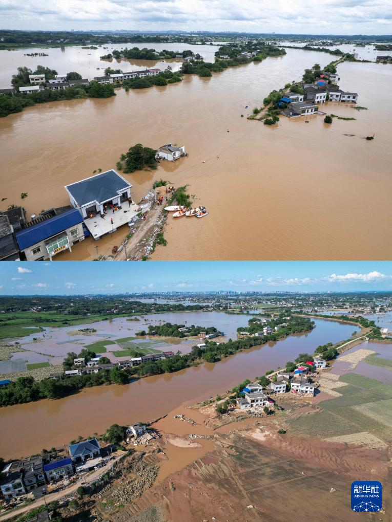 拼版照片:上圖為7月29日12時(shí)拍攝的湖南省湘潭縣易俗河鎮(zhèn)四新堤決口現(xiàn)場(chǎng)(無(wú)人機(jī)照片);下圖為7月30日16時(shí)拍攝的湖南省湘潭縣易俗河鎮(zhèn)四新堤決口現(xiàn)場(chǎng)(無(wú)人機(jī)照片)。新華社記者 陳思汗 攝