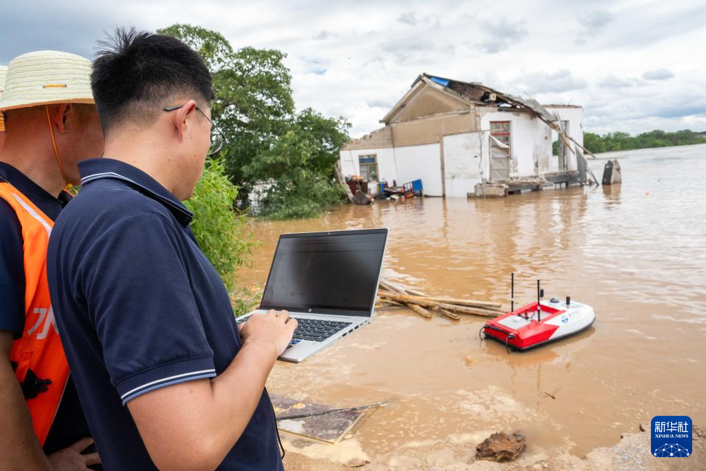 7月29日,在湖南省湘潭縣易俗河鎮(zhèn)四新堤決口現(xiàn)場(chǎng),水利部門工作人員在測(cè)量決口附近的水深、流速等信息。新華社記者 陳思汗 攝