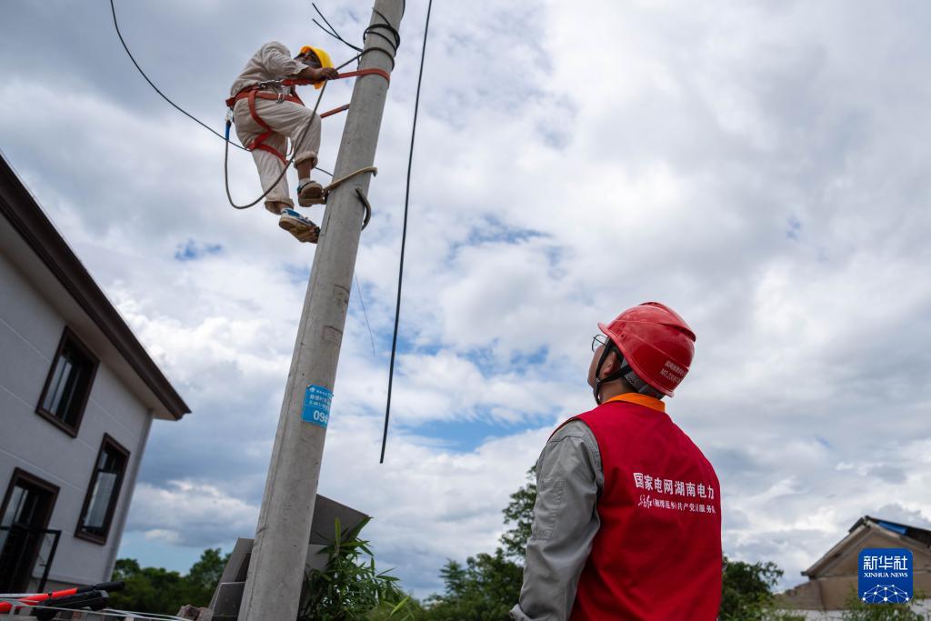 7月29日,在湖南省湘潭縣易俗河鎮(zhèn)四新堤決口現(xiàn)場(chǎng),搶險(xiǎn)人員在處理決口附近的電線。新華社記者 陳思汗 攝