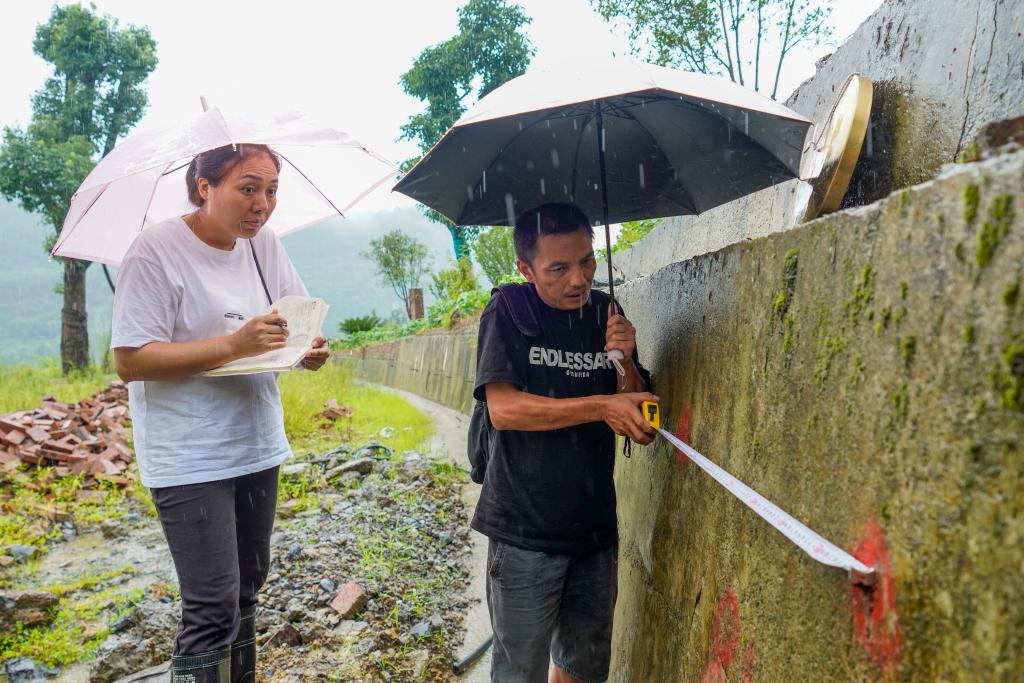 7月30日,富強村村黨支部書記謝小紅(左一)和地質災害監測員魯業江(右一)一起對富強村一處地質災害點進行測量和監測。新華社記者 劉潺 攝