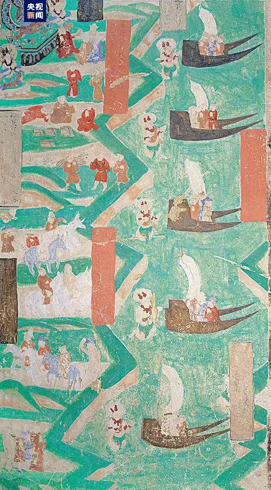 帆船:五只雙尾帆船方頭平底,尾尖上翹呈燕尾狀,每只船上均坐三人,河岸曲折蜿蜒,岸上行人往來穿梭,一場(chǎng)盛大的航行正在啟幕。莫高窟第98窟,五代。