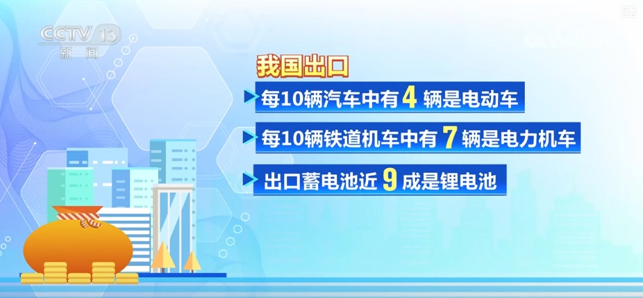據(jù)海關(guān)統(tǒng)計(jì),我國出口的每10輛汽車中有4輛是電動(dòng)車,每10輛鐵道機(jī)車中有7輛是電力機(jī)車,出口蓄電池近九成是鋰電池,外貿(mào)出口的綠色屬性更強(qiáng)。