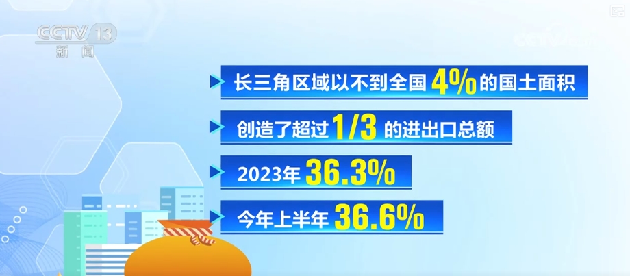 長三角區(qū)域以不到全國4%的國土面積,創(chuàng)造了超過三分之一的進(jìn)出口總額,2023年36.3%,2024年上半年36.6%。
