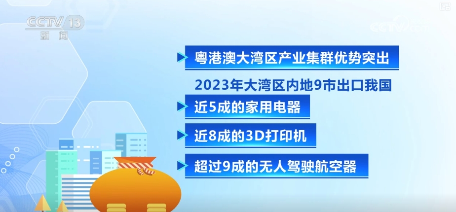 粵港澳大灣區(qū)產(chǎn)業(yè)集群優(yōu)勢突出,2023年,大灣區(qū)內(nèi)地9市出口了我國近五成的家用電器、近八成的3D打印機(jī)和超過九成的無人駕駛航空器。