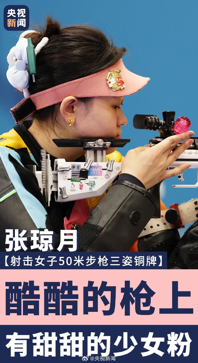 8月2日,在巴黎奧運會射擊女子50米步槍三姿決賽中,中國選手張瓊月奪得銅牌。戴著粉色帽子的張瓊月,步槍上貼滿可愛的Hello Kitty貼紙,用最萌的裝備打最穩的槍!