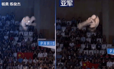我們把動作放慢,對冠亞軍選手動作作對比,不難發現,在空中轉體翻騰動作和入水水花上,中國的兩位選手明顯更勝一籌。