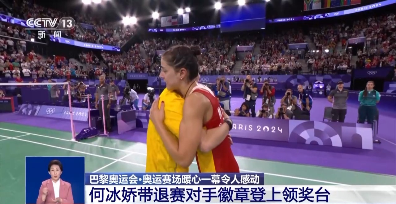 在羽毛球女單決賽中,中國選手何冰嬌0∶2不敵韓國的安洗瑩,收獲一枚銀牌。頒獎儀式上,何冰嬌在舉起獎牌的同時,拿出了一枚帶有西班牙國旗的徽章,向半決賽中因傷退賽的西班牙名將馬林送上慰問,祝愿她能夠早日康復(fù),重回賽場。運動員之間不只有競爭,也有惺惺相惜、互相尊重,這也是奧林匹克精神的一種體現(xiàn)。
