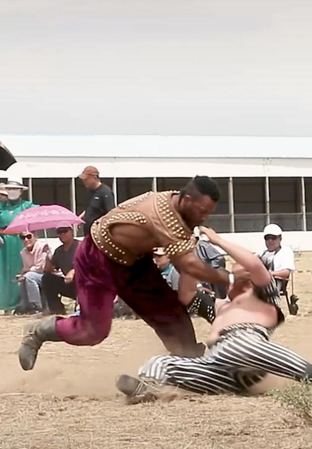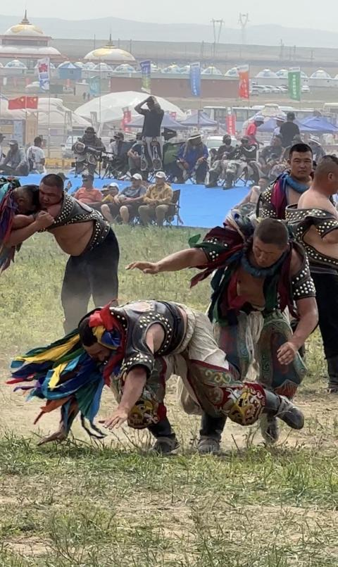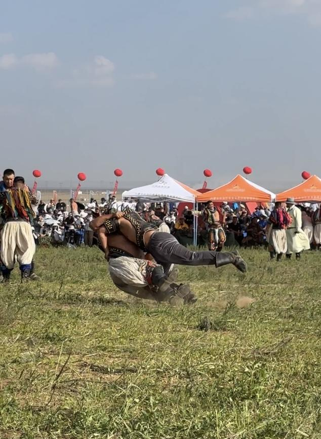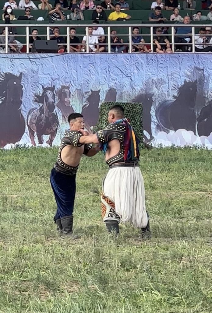 阿斯琴:包括腰力、轉(zhuǎn)動(dòng)能力和手臂的力量。(牧民的傳統(tǒng))馴馬、馴牛、馴駱駝,不能用蠻力,要有巧勁,要有這方面的天賦才行。比賽規(guī)則就是單排淘汰,倒了就不能再上了。一跤定勝負(fù),這是它摔跤的特點(diǎn)。