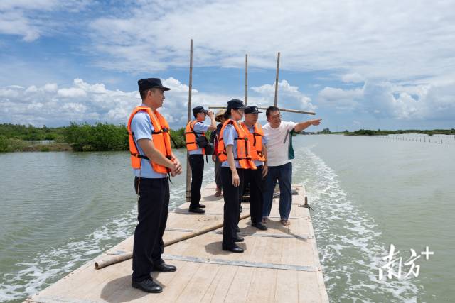 正是開工的好時候。4人熟練地登上舢板,沿著海岸線劃行,駛往保護區深處一個養殖塘。他們不時站到船頭,仔細打量岸邊的紅樹林,不斷向魚塘主老黃問話。