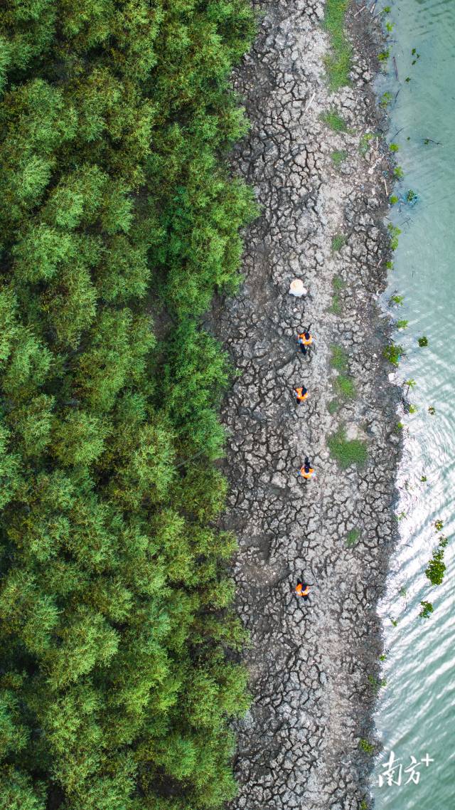 說話間,大家伙各就各位、有序分工,拍照的拍照、記錄的記錄。“樹寶寶”配合地排排立正,在風中“搖頭晃腦”。此時,“技術控”李明霖飛起一架無人機,從高空拍下“大合影”和視頻,解釋道:“后續還要比對片區紅樹林總體長勢變化。”