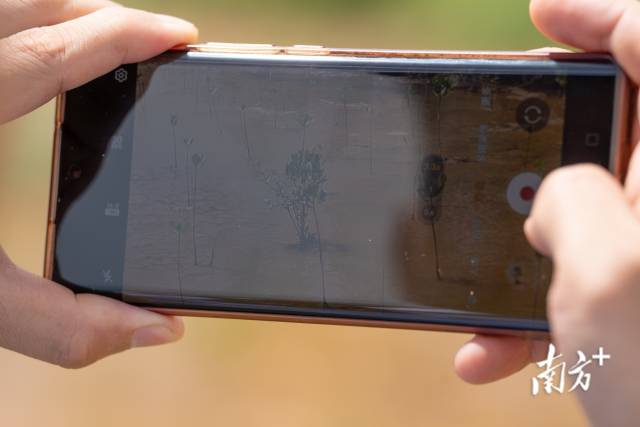 李明霖用手機拍下剛復種不久的“樹寶寶”。通過不同時間的影像對比,他們可以監測紅樹林總體長勢。