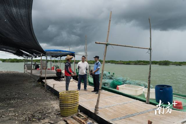 暴雨前夕,楊健宏正與保護區管理局工作人員向魚塘主科普紅樹林保護知識。