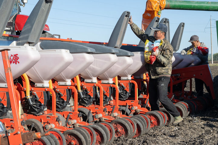 農民在黑龍江省集賢縣一片耕地里向播種機中添加大豆種子(2024年5月9日攝)。新華社記者 謝劍飛 攝