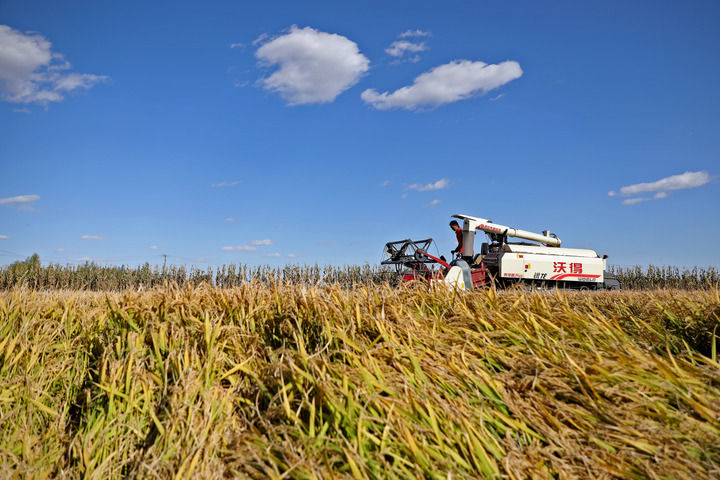 農業機械在遼寧盤錦市遼河三角洲尤巧元家庭農場的稻田里收割水稻(2023年10月20日攝)。新華社記者 姚劍鋒 攝