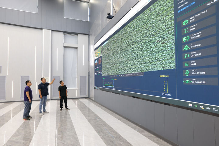 在黑龍江北大荒集團趙光農場有限公司科技服務中心,農業科技人員通過田間物聯網系統在數字農業指揮大廳實時觀看智能無人機回傳的視頻,及時查看田間作物長勢情況(2024年7月22日攝)。新華社發(錢泊羽攝)