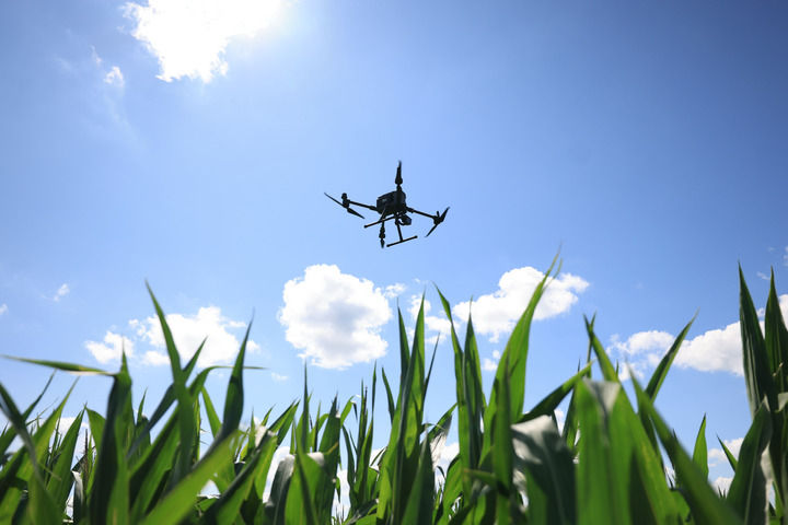 在黑龍江北大荒集團趙光農場有限公司農業科技園區,一臺智能無人機按照規定時間、規定路線進行自動巡田作業(2024年7月22日攝)。新華社發(錢泊羽攝)