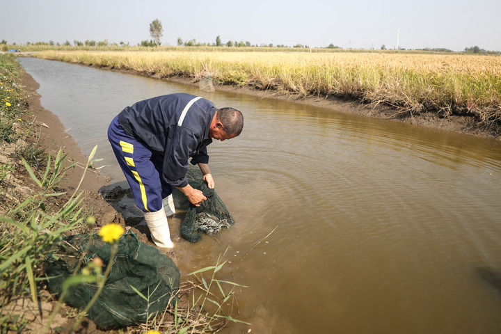 工作人員在遼寧盤錦市大洼區三角洲“蟹稻+”綜合種養模式試驗基地的稻田收獲河蟹(2022年9月28日攝)。新華社記者 潘昱龍 攝