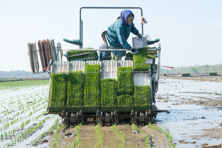 在黑龍江北大荒集團前哨農場有限公司,農民駕駛插秧機進行水稻插秧作業(2024年5月8日攝)。新華社記者 謝劍飛 攝