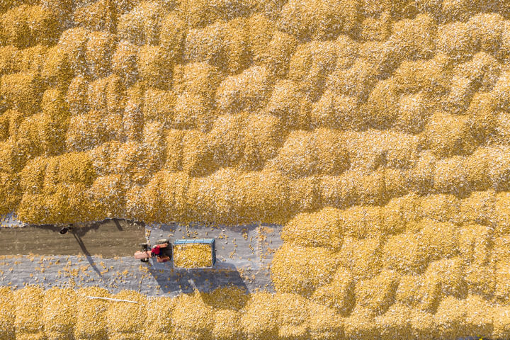 在黑龍江省肇東市五里明鎮東升村,農民把收獲的玉米運到當地農業合作社指定的地點進行晾曬(2023年10月19日攝,無人機照片)。新華社記者 謝劍飛 攝