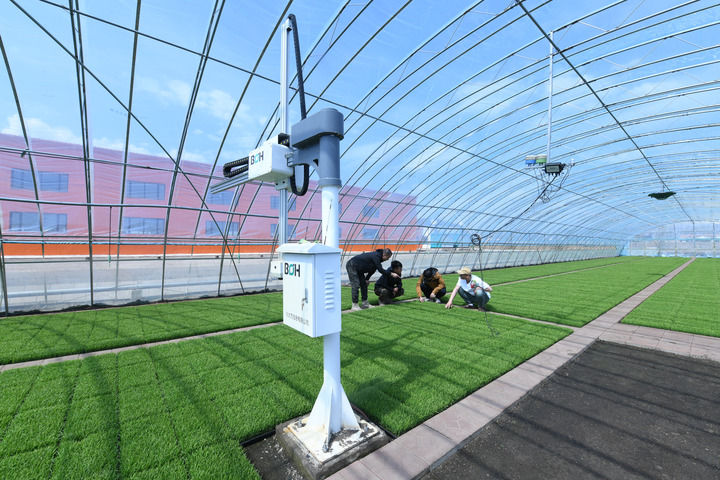 在黑龍江北大荒農業股份有限公司友誼分公司水稻智能育秧中心的水稻育秧大棚中拍攝的智能控溫控水管理系統(2024年4月24日攝)。新華社記者 王松 攝