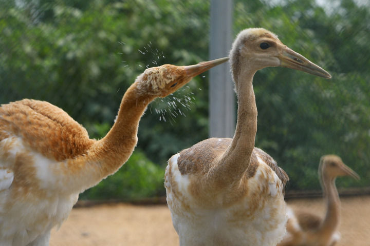丹頂鶴雛鳥在遼寧盤錦市林業和濕地保護服務中心鶴類繁育保護站內嬉戲(2023年8月3日攝)。新華社記者 陳為 攝