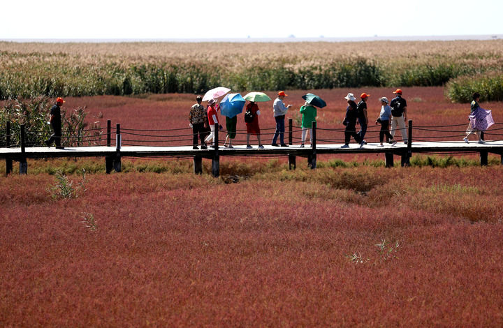 “景區內3萬畝紅海灘與海洋、蘆葦蕩構成了一幅奇美畫面,是難得一見的河口濕地景觀。”盤錦紅海灘旅游發展有限公司董事長孫煥新這樣說。