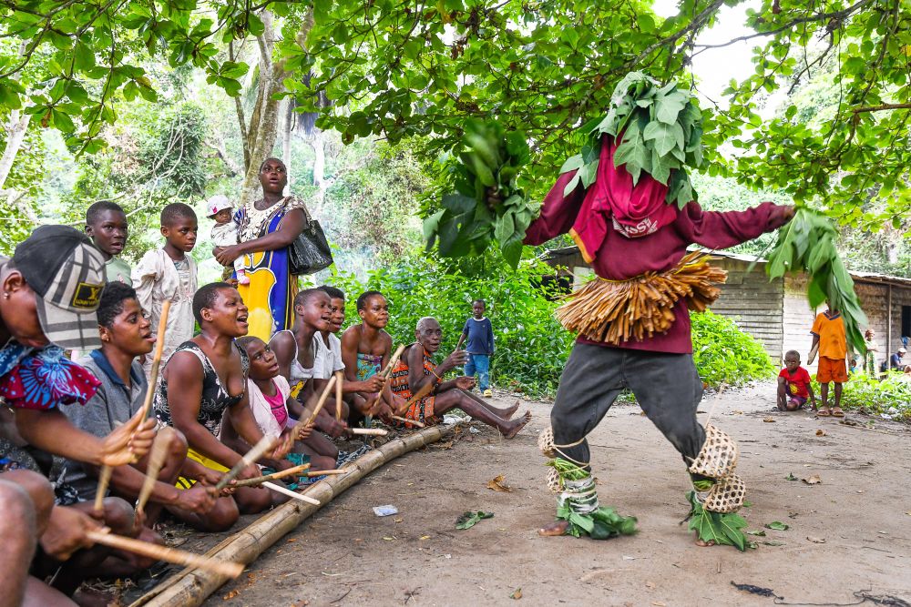 7月11日,在喀麥隆南部大區克里比市,恩杜馬萊村的俾格米人村民舉行慶祝活動。新華社發(科普索攝)