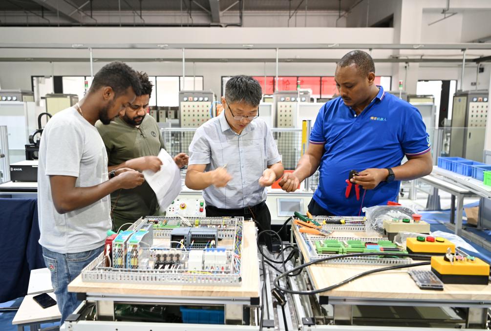 在天津職業技術師范大學,老師帶領韓士蘭(右一)和其他留學生進行實訓操作(2022年7月29日攝)。韓士蘭來自埃塞俄比亞,在天津學習期間,韓士蘭積極利用學校先進的職業教育實踐條件,專注于人工智能制造和工業機器人方向的研究。新華社記者李然 攝
